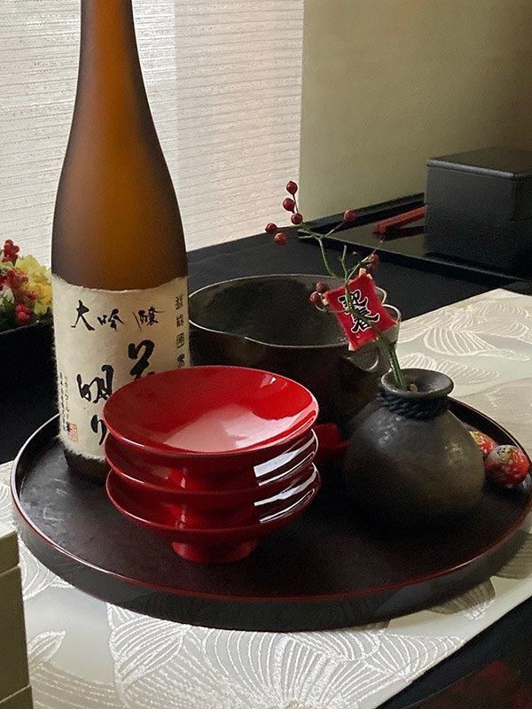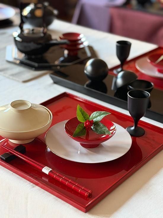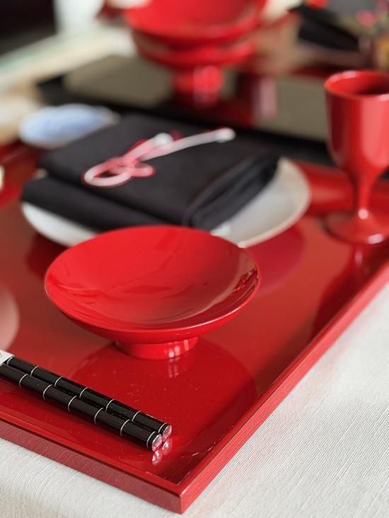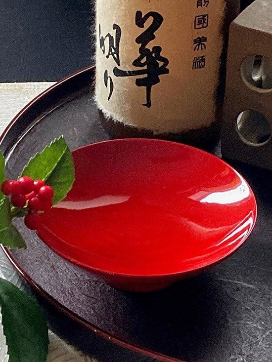 朱塗りの盃はお正月のテーブルに華やかさを演出してくれます。新年のおめでたい席でお酒をいただくのもよし、黒豆などおせち料理を盛り付ける小皿としてお使いになっていいでしょう